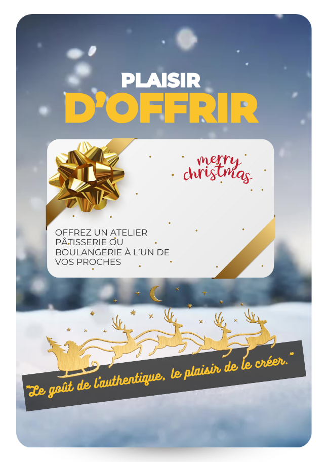 Offrez l'art de la boulangerie, à une époque où l'on revient aux sources, offrir un savoir-faire est le plus beau des présents. Nos ateliers ne sont pas de simples cours, ce sont des moments de partage où nous transmettons les gestes précis, les techniques et le respect des ingrédients de qualité. En offrant un Bon Cadeau, vous offrez : - Une initiation. - Le plaisir de mettre la main à la pâte. - Des souvenirs délicieux et des compétences à vie. - Une coupure avec le quotidien, les mains dans la farine. - Offrez la fierté du cuit et réalisé par soi-même.