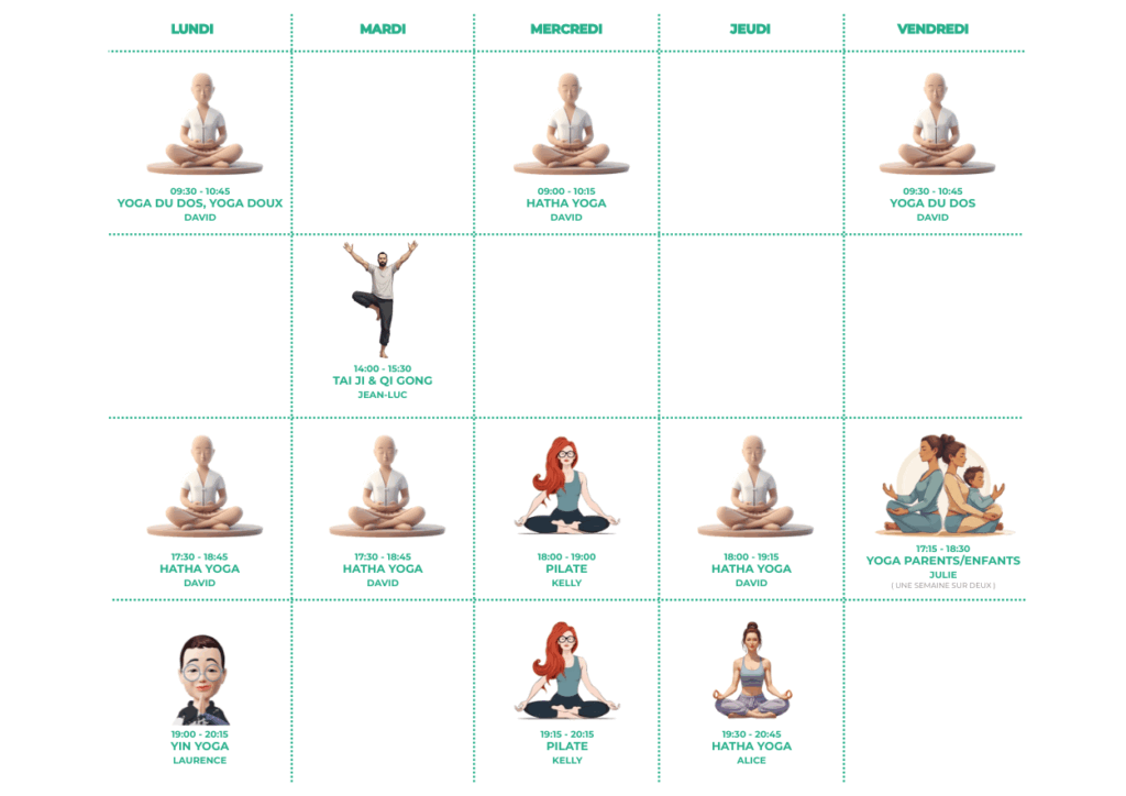 Différents cours de yoga sont proposés, pour tous et pour tous niveaux ! Vous faites partie d’une entreprise qui est soucieuse du bien-être de son équipe ? Nous vous proposons également des séances de yoga durant le temps de midi tous les lundis !